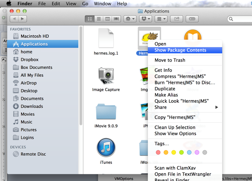 -DSolace_JMS_Browser_Timeout_In_MS=1000 to the Java command.Step 1. Open the Applications directory in Finder. Right-click on the HermesJMS icon and select "Show Package Contents".
